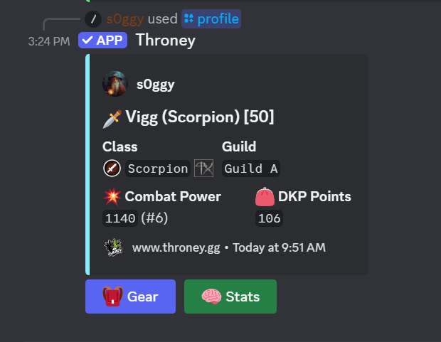 Upload your current gear to Throney’s database, allowing for accurate tracking and display within your guild.